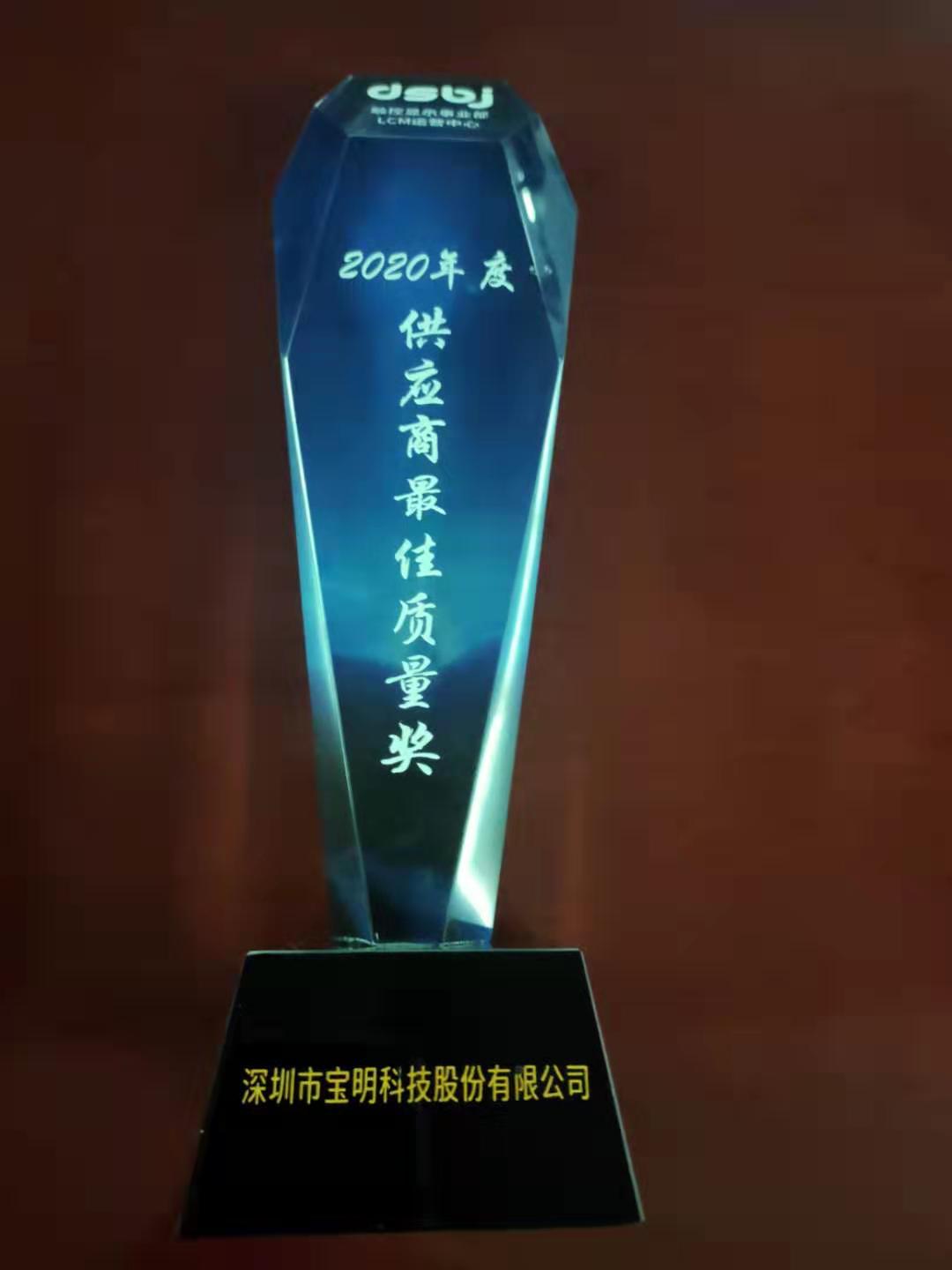2020年我司以“品质、交期、服务”各方面综合优异表现荣获东山精密2020年度“供应商最佳质量奖”,并获颁奖杯。