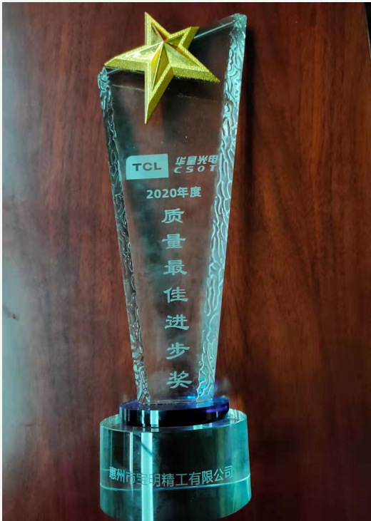 2021年3月10日在华星光电2020年优秀供应商表彰活动中,万搏wanbo(中国)官方荣获 “质量最佳进步奖”。并获颁奖杯。